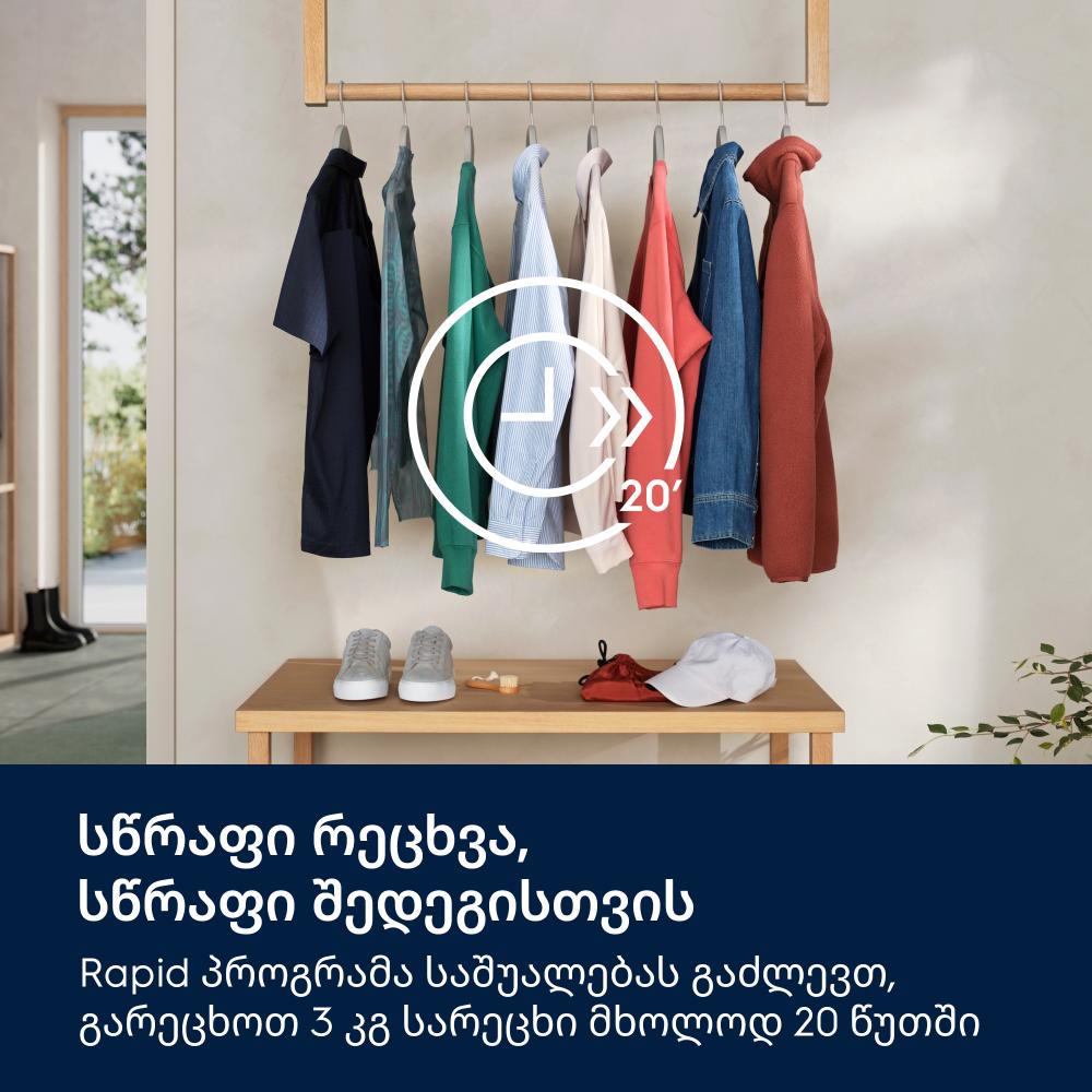 Rapid პროგრამა საშუალებას გაძლევს სწრაფად გაარეცხო მსუბუქად დაბინძურებული სამოსი - გარეცხე 3 კილოგრამამდე სარეცხი მხოლოდ 20 წუთში.