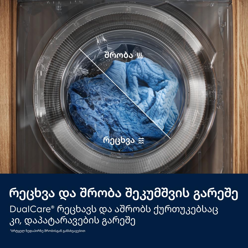 DualCare® გაძლევს თავისუფლებას გარეცხო და გააშრო სამოსი სრული ნდობით. Woolmark Blue სერტიფიცირებული სისტემა არეგულირებს ტემპერატურასა და დოლურის მოძრაობას ისე, რომ ეფექტურად რეცხავს და აშრობს შალის და გარე სამოსსაც კი შეკუმშვის გარეშე.