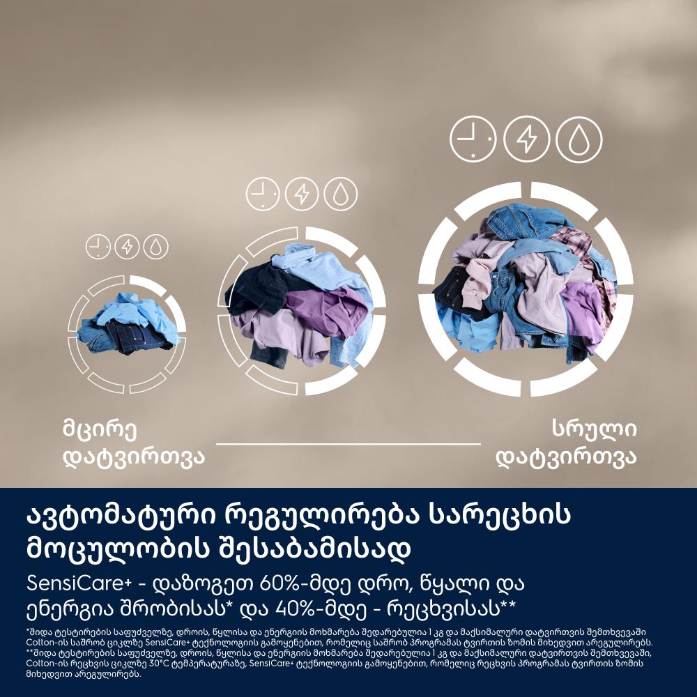 SensiCare+ – დაზოგე დრო, წყალი და ენერგია საშრობზე 60%-მდე, ხოლო რეცხვისას 40%-მდე.