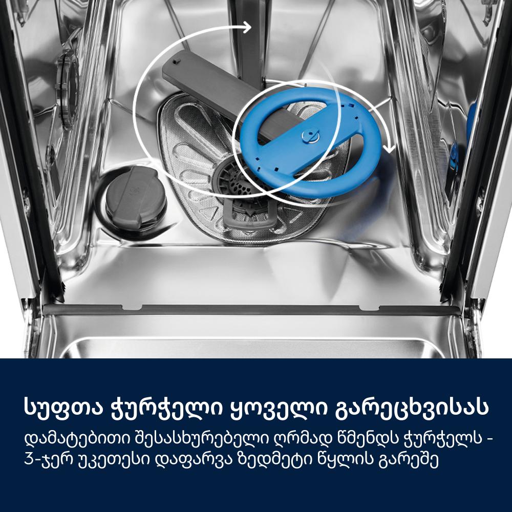 | Special Technologies | • AIRDRY System ციკლის დასრულებისას ავტომატურად ხსნის კარს, რაც უზრუნველყოფს ბუნებრივ ჰაერით შრობას. • Satellite Spray Arm ორმაგი მოძრაობის სპრეი, რომელიც უზრუნველყოფს 3-ჯერ უფრო ეფექტურ რეცხვას. • Intensive Zone . • Third Rack . • Cup Holders . |
